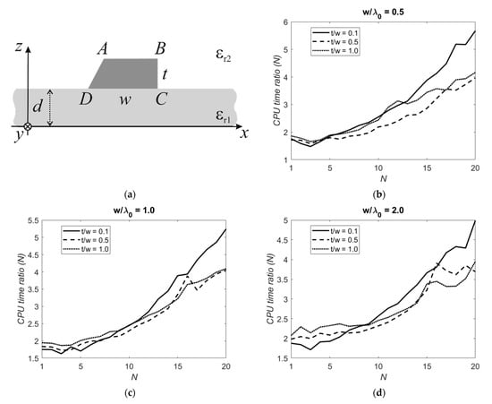 CPU time ratio as a function of the number of expansion functions used for each component of the surface current density on each side of the trapezoidal cross-section strip (N) with , , , , , , , for , and . (a) Geometry of the problem; (b) CPU time ration for ; (c) CPU time ration for ; (d) CPU time ration for .