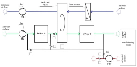- Comino, F.; De Adana, M.R.; Peci, F. Energy saving potential of a hybrid HVAC system with a desiccant wheel activated at low temperatures and an indirect evaporative cooler in handling air in buildings with high latent loads. Appl. Therm. Eng. 2018, 131, 412–427. [Google Scholar] [CrossRef]