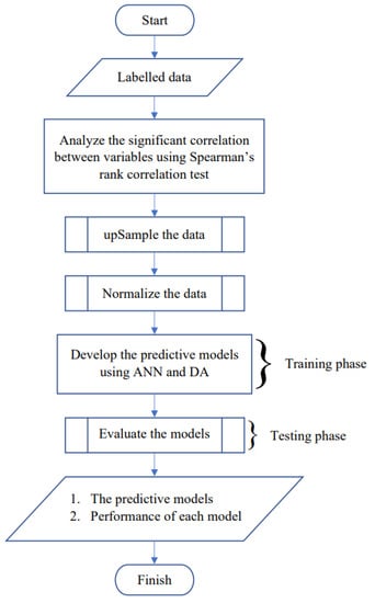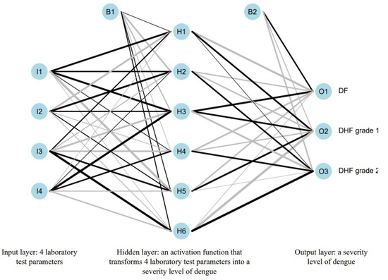 As mentioned previously, we developed models to predict the severity level of dengue with ANN and DA. The models will be able to predict the severity level of dengue based on the laboratory test results of the corresponding patients. The accuracy of both models developed with ANN and DA would be evaluated, and the one with the higher accuracy would be the proposed model. For short, we mentioned the models as “predictive models” in Figure 1.