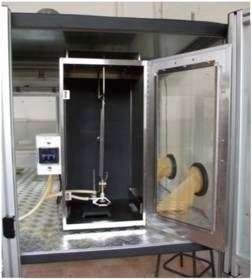 The fire testing was carried out by means of a flammability test facility (FTF) in compliance with the ASTM D6413 international standard. The FTF, fabricated by Govmark Testing Services, was realized in a ventilate stainless steel chamber (see Figure 1). Inside the chamber, a stationary burner with a gas pilot tube is allocated. The flame is adjustable by two gas inlet controlling valves (one on the methane gas cylinder and the other outside the chamber). A flame controller was placed on the left side of the cabinet, with a timer for the measurement of the flame time, the after-flame and after-glow time (see definitions below). The evacuation flow rate was 2 m3/h, and the chamber was placed in a hood in order to evacuate eventual burning smokes after the test execution. The samples subjected to the flammability test were 6 mm–thick rectangular slabs (dimensions: 300 × 64 mm2); one test series was carried out on two-layered samples, to assess the influence of thickness. The test method approached the procedure of ECSS-Q-70-21A standard [8]. The samples were conditioned in a clean room, at 23 °C, for at least 24 h; then the test was performed within 4 min after the removal of the sample from the clean room. Flame height and position (centered at the bottom edge of the tester) were adjusted before the test (i.e., without the sample), and the pilot flame was left lighted. The sample was then positioned vertically to the flame. The purpose of the test is to determine the material’s flammability characteristics by the exposure to a flame applied at the bottom edge of the material samples [9,23,24,25,26,27,28]. The flame-time was currently set to 12 s for different materials comparison; the reference thermoplastic was also tested at several flaming time intervals, in order to gain further knowledge about the fire-retardant effective dynamics. The testing recorded temperature (measured by K-thermocouples) was around 450 °C. The main measured parameters were as follows: