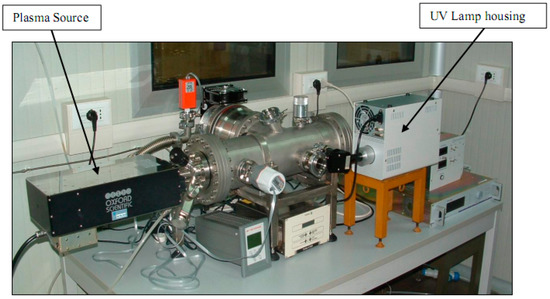 The adopted UV/AtOx test facility simulates the ultraviolet irradiation and the atomic oxygen impact effect in low orbit space environment [16,19,20]. It is constituted by a small chamber (see Figure 2) equipped with a rotary vane pump and a Varian V-550 turbo-molecular pump in order to set ultra-high vacuum conditions (minimum pressure achievable: 10−5 Pa). The aim of the UV/AtOx test is the evaluation of the material degradation in terms of mass loss due to erosion: The samples are weighted before and after the test, using a Mettler-Toledo XP26DR microbalance (precision: 1 μg). The tests are performed in a clean room conditioned at room temperature for 48 h, at a mean pressure of 2.6 × 10−1 mbar, in order to avoid weight errors due to moisture losses.