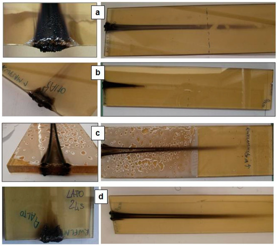 Some pictures of the tested samples are reported in Figure 3. All the uncoated Radel samples showed no glow and did not spread visible amount of material during the test. The exposure to the flame gradually damaged the materials: A thin line distinguishing the contour of the charred area is clearly visible. The char length is generally not much extended, but there is an area where matter melting occurred. The obtained findings are in good agreement with results reported in the literature for this kind of thermoplastic material (see, in particular, Table 3 in Reference [12]. The damaged length describes such phenomena: In the melted area, the materials still show a visible transparency; this area is smooth and it is not detectable by handle touch. The charred area is more evident at the external sides of the slabs: It is irregular, and little bulges are detected, likely due to gas releasing during combustion (Figure 3a).