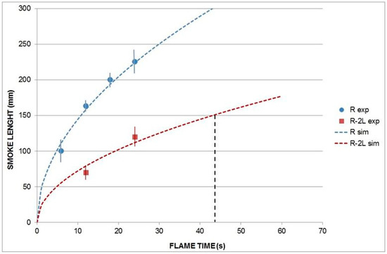 The measured smoke lengths indicate that only R-2L test series satisfied the abovementioned condition of damaging propagation limited to one half of sample height (150 mm) for the scheduled time of flame exposure (12 s). The correspondent results obtained by analyzing the base PSU in shorter and longer tests allow us to gain insights about the damage evolution, in order to estimate an optimal thickness and envisage the material performance for prolonged flame exposures. Experimental data of smoke length measured at four/two flame-times for Radel R/R-2L specimens are reported in Figure 4, where the curves estimating the effective behavior of single and double-layered material are obtained by simple physical modeling. A generic power law regression based on a functional behavior as