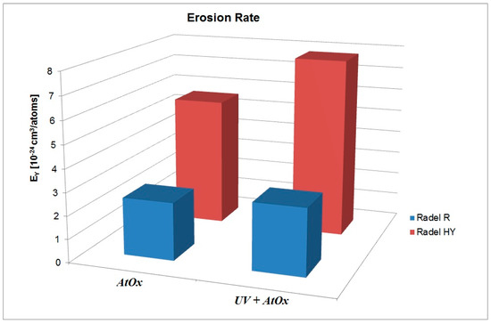 UV and AtOx aging characterization was carried out on the pure Radel R and on the hybrid coated R-HY. The effect of AtOx alone was first analyzed, and then the specimens were subjected to the blending UV+AtOx flux, as an attempt to discriminate different degradation phenomena and to appreciate the synergic erosion due to the combined action of two aging factors. Six samples (dimensions: 20 × 20 × 6 cm3) for each kind of material were analyzed in all the tests; the corresponding results about the erosion rate EY are given, by average, in Figure 5, recalling that this parameters is calculated from the measured mass loss, ΔM, by using the following relationship: