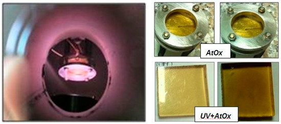 The effect of UV exposure on the Radel R material is evident by the comparison between the appearance of the surface before and after the test (Figure 6). It is noticeable that the sample surface changed from light to dark yellow; thus, the transparency is, even though not dramatically, quite affected by UV radiation. That is the so-called “darkening effect”, due to UV photon energy high enough to cause surface molecule activation and organic bond breakage, resulting in the degradation of the polymer optical properties [14,29]. After AtOx alone exposure, on the contrary, the samples’ transparency appeared almost unchanged, with no evident changes of the surface morphology. The erosion yield obtained in the adopted experimental setup is in good agreement to the results obtained for poly-sulfone materials in the most of other ground-based facilities, as well as in space-flight experiments [2,13,15]. The low surface recession shown by Radel R testified the good anti-oxidation properties of poly-sulfone materials, which are supposed to be due to residue formation after the exposure to LEO environment, acting as a barrier layer that slows down the material erosion. Such capability, on the other hand, is strictly related to the worsening of the material optical properties, as, for example, the degradation of the polymer original transparency.