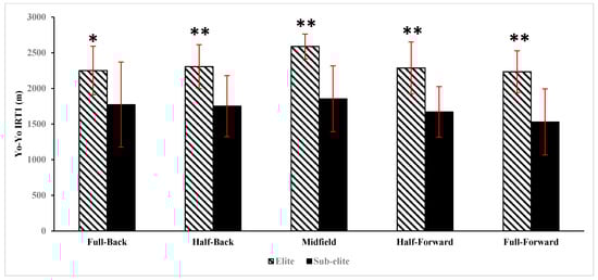 Yo-yo intermittent recovery test level 1 (Yo-Yo IRT1) distance (m) across hurlers with respect to position and level of play. Data presented as mean ± standard deviation (SD). Significantly greater than sub-elite at respective positions = * (p < 0.05), ** (p < 0.001).