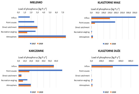 Considering the proportion of individual sources of contamination in the context of phosphorus supplies, the biggest hazard to water quality in the lakes were as follows: angling in Mielenko Lake (ca. 45%); point sources (ca. 42%) and the Lake Mielenko tributary (ca. 34%) for Karczemne Lake; the Klasztorna Struga Lake tributary (ca. 60.4%) and point sources (ca. 36%) for Klasztorne Małe Lake; and the Klasztorne Małe Lake tributary (ca. 95%) for Lake Klasztorne Duże.