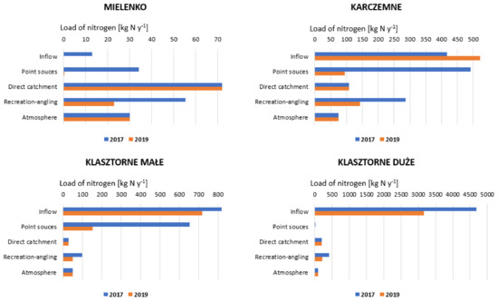 The recharge of Klasztorne Duże Lake with nutrients originated from areal sources (1.3 kg P y−1, 206 kg N y−1), inflows from Klasztorne Małe Lake and the surrounding forest tributaries (952 kg P y−1, 4680 kg N y−1), point sources (0.3 kg P y−1, 4 kg N y−1), atmospheric sources (20 kg P y−1, 95 kg N y−1) and recreational sources (20.1 kg P y−1, 407.1 kg N y−1) (Figure 3 and Figure 4). The total phosphorus load introduced to Klasztorne Duże Lake in 2017 was 993.7 kg P y−1 (per lake area 1.755 g P m2 y−1), and that of nitrogen was 5392.1 kg N y−1 (per lake area 9.526 g N m2 y−1). In 2019, after protective treatments were implemented, the external load of nutrients was lower: areal sources (1.3 kg P y−1, 206 kg N y−1), inflow from Klasztorne Małe Lake and the surrounding forest tributaries (434.7 kg P y−1, 3162.8 kg N y−1), point sources (<0.1 kg P y−1, 0.3 kg N y−1), atmospheric sources (20 kg P y−1, 95 kg N y−1) and recreational sources (10 kg P y−1, 215 kg N y−1) (Figure 3 and Figure 4). The total phosphorus load introduced to Klasztorne Duże Lake in 2019 was 466 kg P y−1 (per lake area 0.823 g P m2 y−1), and the total nitrogen load was 3678.8 kg N y−1 (per lake area 6.499 g N m2 y−1).