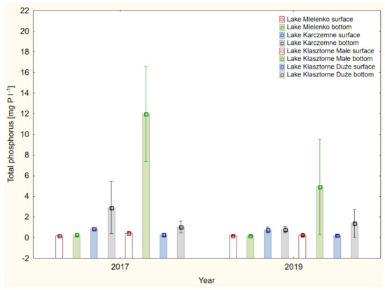 In 2017, in the case of Klasztorne Duże Lake, the mean content of TP in the surface water layer was 0.275 mg P L−1 (±0.118), and in the near-bottom water, it was 1.024 mg P L−1 (±0.566). In 2019, after protective techniques were implemented, the mean concentration of TP was 0.219 mg P L−1 (±0.066) in the surface water of Klasztorne Duże Lake, while that at the bottom was 1.396 mg P L−1 (±1.367) (Figure 5, Table 4).