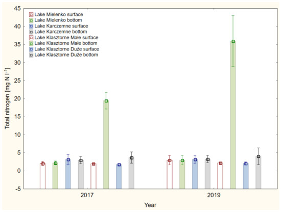 In the surface water layer of Klasztorne Duże Lake, in 2017, the mean content of TN was 1.740 mg N l−1 (±0.273), and that of the near-bottom water layer was 3.664 mg N l−1 (±1.565) (Figure 6, Table 4). In 2019, after modernization of the city’s sewage system, the mean concentration of TN in the surface water layer of Klasztorne Duże Lake was 2.035 mg N l−1 (±0.449), while at the bottom, it was 4.065 mg N l−1 (±2.319).
