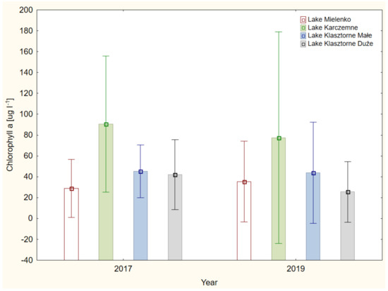 The cutting off sewage inflow to lakes did not cause significant variability in the chlorophyll a content and SD visibility values in the lakes (Table 3). In 2017, the average chlorophyll a level in the water of Mielenko Lake was 28.9 µg l−1 (±13.88), and in 2019, after protective treatments were implemented, it was 35.4 µg l−1 (±19.38) (Figure 7, Table 4). In the water of Karczemne Lake, the mean content of chlorophyll a in 2017 was 90.4 µg l−1 (±32.60), while in 2019, it was 77.4 µg l−1 (±50.70) (Figure 7, Table 4). In 2017, in Klasztorne Małe Lake, the average chlorophyll a level was 45.3 µg l−1 (±12.65), and in 2019, it was 43.8 µg l−1 (±24.27) (Table 4). In 2017, the average chlorophyll a content in the water of Klasztorne Duże Lake was 42.1 µg l−1 (± 16.81), while in 2019, it was 25.6 µg l−1 (± 14.53) (Figure 7, Table 4).