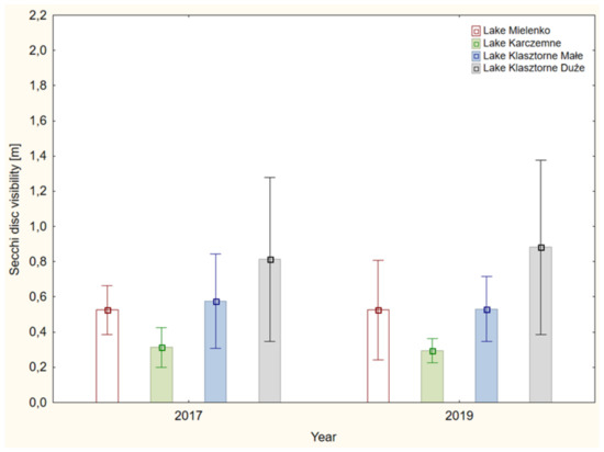 The mean value of Secchi disc visibility (SD) in 2017 in Mielenko Lake was 0.525 m (±0.138), and in 2019, it was also 0.525 m, but with standard deviations of -±0.282 (Figure 8, Table 3). In 2017, the average Secchi disc visibility in Karczemne Lake was 0.312 m (±0.112), and in 2019, it was 0.293 (±0.067) (Figure 8, Table 4). In Klasztorne Małe Lake, in 2017, the mean Secchi disc visibility was 0.575 m (±0.267), while in 2019, after modernization of the city’s sewage system, it was 0.531 m (±0.185) (Figure 8, Table 4). In 2017, the average Secchi disc visibility in Klasztorne Duże Lake was 0.812 m (±0.467), and in 2019, it was 0.881 m (±0.494) (Figure 8, Table 4).