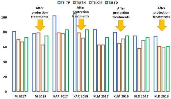 In collected water samples was determined: (total phosphorus) TP, chlorophyll a according to Hermanowicz et al. [28], (total nitrogen) TN (SHIMADZU TOC/TN5000 analyzer), and water transparency by Secchi disc visibility (SD). Every analysis was performed on each triplicate with coefficient of variation according to Kaca [29]. The TP, TN, chlorophyll a, and SD visibility results were statistically analyzed (maximum, minimum, average, Standard deviation, one-way ANOVA, Fisher coefficient F > 1, significance level—p = 0.05) [30]. In average values of water parameters were studied significant differences between the year of sewage inflow (2017) and the year after cutting off sewage inflow (2019). The indicators TSITP, TSITN, TSISD, and TSICHL were calculated according to Carlson [31] and Kratzer and Brezonik [32].