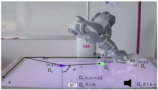 where D is the interactive table diagonal, are the polar coordinates of the green object in the system centred on the blue object, , is the distance between the blue object and closest table corner, and is the distance between the end effector position on the table and the green object.
