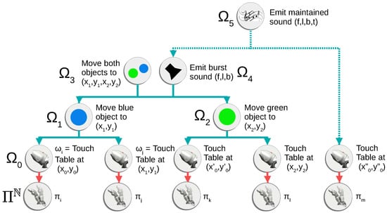 The outcome space is a composite and continuous space (for the physical setup , for the simulation setup ), containing subspaces of 2 to 4 dimensions. Multiple interdependencies are present between tasks: controlling the position of either the blue object () or the green object () comes after being able to touch the table at a given position (); moving both objects () or making a sound () comes after being able to move the blue and the green object, the maintained sound () is the most complex task of the physical setup. This hierarchy is shown on Figure 2.