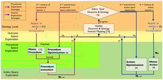Grounding our work in cognitive developmental robotics [,], we propose an intrinsically motivated learner able to self-organize its learning process for multi-task learning of hierarchically organized tasks by exploring action, task and task decomposition spaces. Our proposed algorithm combines autonomous exploration with active imitation learning into a learner discovering the task hierarchy to reuse its previously gained skills for tackling more complex ones, while adapting the complexity of its actions to the complexity of the task at hand.