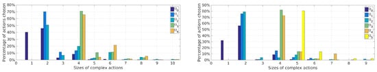 If we look at the choices of strategy and goal outcomes for the whole learning process (see Figure 25 and Figure 26), we can see that this difference in the learning processes is visible in the number of times each of the two main combinations of task and goal outcome space was chosen: Left-Yumi-SGIM-TL favors more working autonomously on procedures for exploring whereas Left-Yumi-SGIM-PB worked more on autonomous exploration of actions for .
