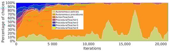 - the timing of these demonstrations has no influence. However, in curriculum learning the timing of knowledge transfer should be essential. Furthermore, the agent best knows when and what information it needs from the teachers, and active requests for knowledge transfer should be more efficient. For instance, a reinforcement learner choosing when to request social guidance was shown in [] making more progress. Such techniques are called active imitation learning or interactive learning, and echo the psychological descriptions of infants’ selectivity in social partners and its link to their motivation to learn [,]. Active imitation learning has been implemented [] where the agent learns when to imitate using intrinsic motivation for a hierarchical RL problem in a discrete setting. For continuous action, state and goal spaces, the SGIM-ACTS algorithm [] uses intrinsic motivation to choose not only the kind of demonstrations, but also when to request for demonstrations and who to ask among several teachers. SGIM-ACTS was extended for hierarchical reinforcement learning with the algorithm Socially Guided Intrinsic Motivation with Procedure Babbling (SGIM-PB) in []. In this article, we will study whether a transfer of a batch of data or an active learner is more efficient to learn task hierarchy.