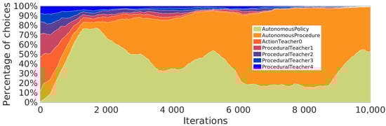 where the progress is the difference between the best competence for before and after the episode, is the cost associated to each strategy. is a meta parameter to favour some strategies such as autonomous ones, to push the robot to rely on itself as much as possible instead of bothering teachers.