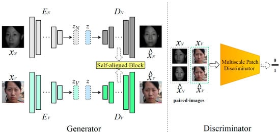 Inspired by [7,33,34], we propose a self-aligned generator for producing ID-consistent aligned NIR-VIS images, including a self-aligned block. As shown in the left part of Figure 2, we utilized two decoders, and , with the same structure in our generator, which was different from the baseline. Note that the architecture of our decoders was the same as that in the baseline.