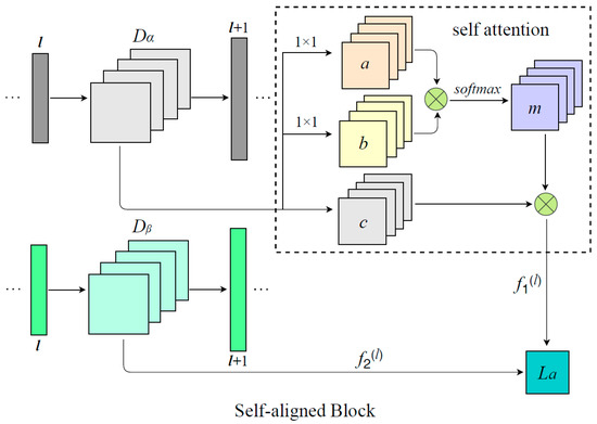 Figure 3 shows our self-aligned block, mainly made up of a self-attention module [35]. First of all, we fetched out the feature maps from the same layer in decoders and . Secondly, we fed features from one domain into the self-attention module. Then, the feature maps were transformed into three parts—a, b and c—with two convolutional layers, which halved the channels of features a and b. Next, parts a and b performed elementwise multiplication, followed by a convolutional layer and a softmax operation to get the attention maps m. Finally, was exported from this block through the elementwise multiplication of the feature maps c and attention maps m. The feature maps of other domains in the lth layer were denoted as . We used the Euclidean distance to reduce the semantic gap of the feature maps between two domains: