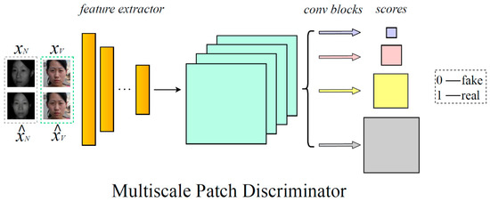 We adopted and in Equations (3) and (4) to restrict the identity consistency, as [8] did. To be specific, restricts the identity consistency between the generated paired images with different modalities, and makes the reconstructed data have the same identity with the raw data. After the reconstruction procedure, we sent the original data and the reconstructed data to our multiscale patch discriminator for adversarial learning, which will be demonstrated in the next section minutely.
