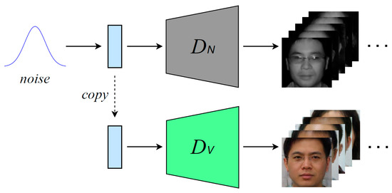 The literature over the years on HFR can mainly be divided into three branches: feature representation-based methods, common subspace projection-based methods and synthesis-based methods. Feature representation-based methods reduce the domain gap between heterogeneous images through handcrafted features such as linear discriminant analysis (LDA) and principal component analysis (PCA) [6]. Common subspace projection-based methods project different modality images into a common subspace [5]. However, there is a lack of a large-scale near infrared-visible (NIR-VIS) face database relative to visible face datasets, which boosts the research of synthesis-based methods [7]. They usually transform NIR images to identity-preserved VIS ones and then evaluate models’ recognition performance on the generated VIS images. Fu et al. [8] creatively proposed a new insight for HFR that utilized Gaussian noise to generate abundant paired NIR-VIS images through a dual variational generation (DVG) model. It covered the few-shot problem of HFR and improved the recognition performance of a limited dataset.