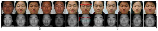 Owing to our proposed self-aligned encoder–decoder architecture, we could not only generate abundant NIR-VIS images, but also align paired images in the raw dataset with our well-trained model by reconstructing them. Figure 6 and Figure 7 show the reconstructed and generated results of the baseline (DVG), as well as our methods, respectively. Figure 6 is the reconstructed results of DVG and SADG. We divided Figure 7 into two parts; part a is the generated results of DVG and part b shows those of SADG.
