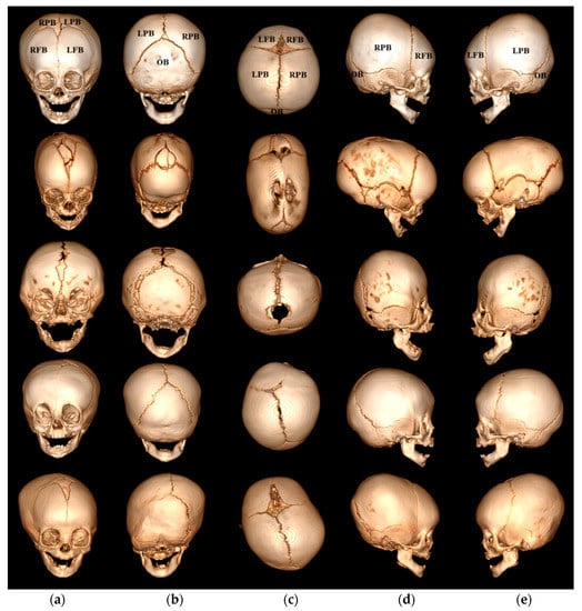 Volume rendering images of normal skull (first row) and skulls of four types of craniosynostosis patients (second to fifth rows: sagittal, bilateral coronal, unilateral coronal, and unilambdoid synsotoses). (a) Front view, (b) back view, (c) top view, (d) right view, (e) left view. (LFB: left frontal bone, RFB: right frontal bone, LPB: left parietal bone, RPB: right parietal bone, OB: occipital bone).