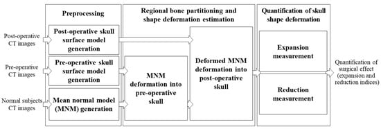 As shown in Figure 2, the proposed method consists of three main steps: (a) preprocessing through skull surface generation and mean normal skull model generation, (b) regional bone partitioning and shape deformation estimation, (c) quantification of skull shape deformation between preoperative and postoperative skulls. In the preprocessing step, the skulls of the patients with craniosynostosis and the normal subjects are semiautomatically segmented from the head CT images and generated into a skull surface model, after which the mean normal skull surface model is generated using the skull surface models of the normal subjects. In the regional bone partitioning and shape deformation estimation step, the mean normal skull surface model is initially deformed into a preoperative skull model in order to divide the preoperative skull into five regional cranial bones, such as the mean normal skull surface model. The deformed mean normal skull surface model is then redeformed into a postoperative skull model. In the step of quantifying skull shape deformation, the expansion and reduction indices are calculated using the positive and negative distance indices and the area ratio indices between the preoperative and the postoperative skulls.