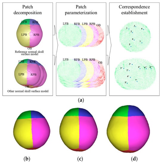 To divide the regional cranial bones separated by opened sutures, we generate a mean normal skull surface model from the shape of the normal skulls with clear sutures. To reflect age-specific shape differences, three mean normal skull surface models are generated for 3~6 months, 7~12 months, and 13~22 months, respectively, and each mean normal skull surface model [14,15] is generated through patch decomposition, patch parameterization, and correspondence establishment, as illustrated in Figure 3a. In patch decomposition, each normal skull surface model is decomposed into five cranial bone patches (left and right frontal bones, left and right parietal bones and occipital bone) based on sutures. In patch parameterization, each cranial bone patch of a normal skull is mapped to a disc shape through barycentric mapping [16]. In correspondence establishment, the point correspondences among corresponding cranial bone patches of reference normal skull surface model and other normal skull surface models are established through one-to-one mapping. The seven landmarks in Figure 3a are arbitrary points on the cranial bone patch of the reference normal skull surface model and other normal skull surface models. Subsequently, the mean normal skull surface model is generated by averaging those corresponding points in the normal skull surface models. Figure 3 shows three mean normal skull surface models and cranial bone patches, specifically left (green) and right (blue) frontal bones, left (yellow) and right (magenta) parietal bones, and occipital bone (red).