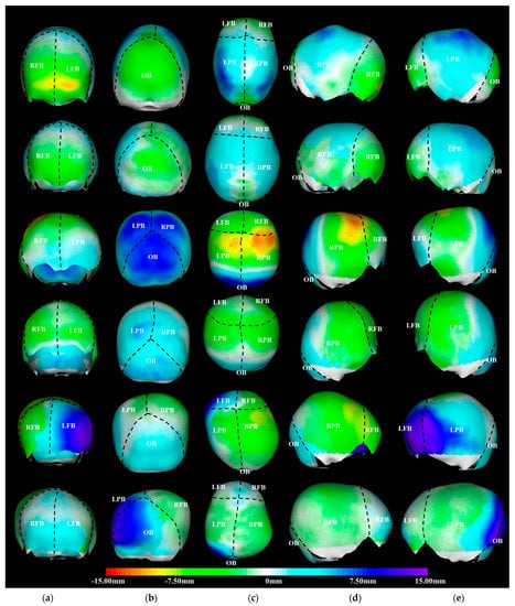 Examples of color-coded visualization of shape deformations (mm) of the skull before and after surgery for representative synostoses of craniosynostosis (first to sixth rows: severe sagittal, mild sagittal, severe bilateral coronal, mild bilateral coronal, unilateral coronal, and unilateral lambdoid synostoses). (a) Front view, (b) back view, (c) top view, (d) right view, (e) left view. (LFB: left frontal bone, RFB: right frontal bone, LPB: left parietal bone, RPB: right parietal bone, OB: occipital bone).