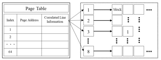 Our proposed model suggests the prefetching method using the correlation of a delta given by the difference between consecutively accessed memory requests. However, it is difficult to observe correlations when deltas are stored without a certain condition. Thus, we stored the address by page, not an original physical address, which limits the delta range from −63 to +63. The page table has 64 entries. To analyze the overall memory access pattern, the table will be updated when a demand request is generated from the LLC. Each page entry stores information about Page_Adr and CorLine_Info. The former stores the accessed address shifted by 12 bits. Hence if both two entries’ values are equivalent, we assume that accessed addresses are on the same page. The page table update depends on whether the page number of the current accessed address is already stored in it. If this page number is already stored, we update the CorLine_Info index stored by the block. By contrast, when the address does not exist in the page table, it will be stored sequentially if there is enough space. When there is no empty entry, a victim page is evicted under the Least recently used (LRU) replacement policy, and consequently, all CorLine_Info of the page is also evicted. The reason for adopting the LRU replacement policy is to match the patterns being accessed while storing information about frequently accessed pages for as long as needed.