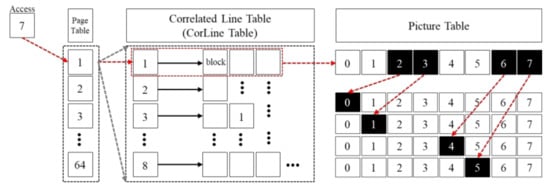 The history table consists of two sub-tables, including a page table and a correlated line table that stores information regarding overall memory access patterns; further to this, it consists of the picture table that is updated only when 4 or 11 more accesses occur on the same page or on the same correlated line. The page table stores page history information about the previously accessed memory requests and has 64 entries of records. The correlated line table belongs to the page table, and up to 64 block indexes can be stored per page. The picture table has 64 entries, which is divided into two sets of 32 entries to store the page access pattern and correlated line access pattern, respectively. Thus, Figure 2 depicts an internal structure of the history table.