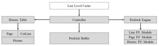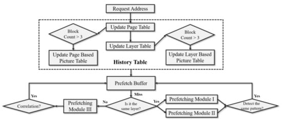 Figure 5 describes the overall structure of the controller, and Figure 6 shows the internal operation flow of the prefetch controller. The controller manages all functions of the prefetch buffer. First, in the history table, an update is applied when memory access is requested from the LLC to the prefetch buffer. The controller checks whether the page number of the current demand request’s address is stored in the page table and refresh the contents of the table consequently.