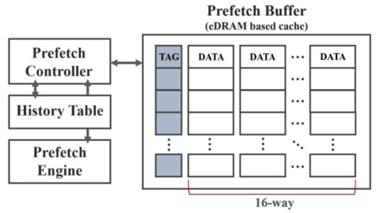 Our proposed model uses a separated eDRAM-based prefetch buffer to aggressively conduct prefetching without causing cache pollution and consuming high-expensive SRAM spaces. The eDRAM has the advantage of operating at low latency with high space per cost. In addition, it has a higher density than the traditional SRAM based on-chip caches. Therefore, we can access the buffer faster than the DRAM-based main memory and achieve a larger storage capacity than that of the LLC. The prefetch buffer is located between the LLC and the main memory. The buffer size is 8 MB, and it stores data in 64-byte block units. Furthermore, it is designed as 16-way set associative structure based on the LRU replacement policy, as shown in Figure 7. Thus, its internal organization is similar to that of LLC cache as Moin et al. suggested a DRAM-based buffer for PCM main memory system in previous study []. However, the only difference is a target functionality of the buffer. The prefetch buffer only stores data that are generated by the prefetch engine, not the demand requests from LLC or main memory system. There are two types of eDRAM, i.e., 1T1C eDRAM and gain cell eDRAM. In this study, we assumed the use of gain cell eDRAM and do not consider the refresh operation issue of eDRAM [].