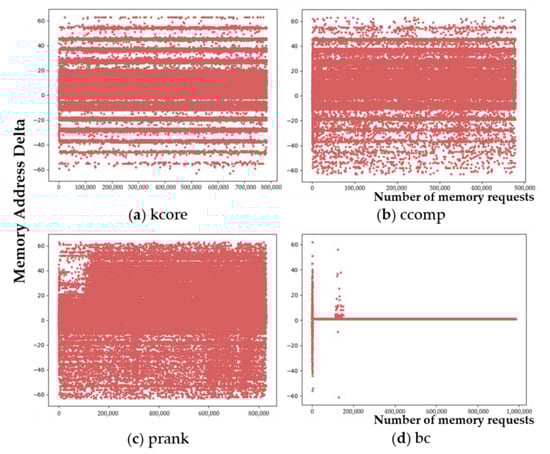 Table 1 shows the computation type of each graph kernel, a kind of memory access pattern, and real use case of each graph workload. As shown in Table 1, graph processing workloads are commonly memory-intensive and have irregular memory access patterns. When this characteristic permeates all levels of caches and memory hierarchy, it leads to a substantially more irregular and complex pattern. Figure 8 shows the distributions of delta values among memory accesses which occur on the same page by one million memory requests caused by LLC misses. In each graph, the x-axis is the number of memory requests from the LLC, and the y-axis is the delta value. In this study, the range of delta is limited from −63 to +63, because we analyze the delta based on page granularity. Throughout Figure 8, we can observe that kcore, ccomp, and prank generate demand requests based on various delta values. In addition, it is difficult to find access patterns and criteria for prefetching. By contrast, in the case of bc, repeated accesses that have the same delta value are observed, which can be treated as a regular access pattern. Therefore, we can determine which prefetcher generates good candidates for irregular or regular demand memory request patterns through various graph processing workloads.