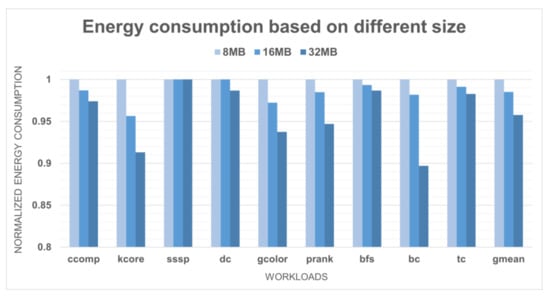 Figure 9 shows the results of the energy consumption with different buffer size configurations. As in the case of the execution time measurement, the 16 MB buffer-based configuration and 32 MB buffer-based configuration possess larger storage spaces and provide better results than the 8 MB buffer in terms of dynamic energy consumption, except static energy consumption such as eDRAM’s refresh energy. When all accessed data are stored in the buffer, the difference in performance may be larger owing to the difference in capacity. Hence, the total energy consumption is less sensitive to the size of the buffer.