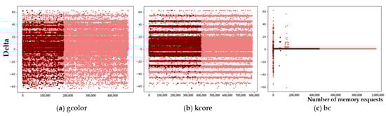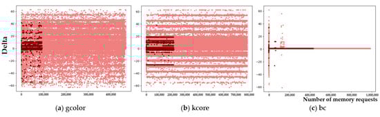 Figure 11 and Figure 12 depicts the visualized results of the prefetcher’s coverage. The dark red area shows the demand memory requests that are covered by prefetcher, hence all those requests are hit in the buffer. And, the light red area shows uncovered demand memory requests, which cause buffer misses. To simplify the visualization, we set the y-axis as memory access delta value, not actual memory addresses, that varies −64 to +64.