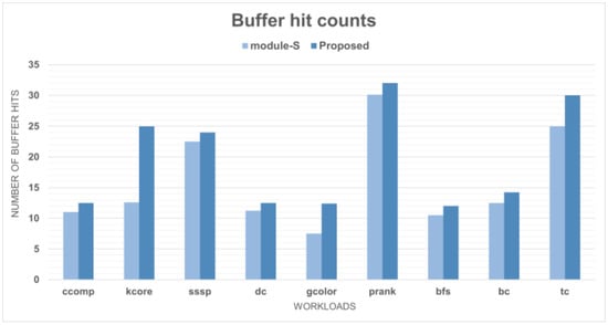 Figure 13 depicts the comparison of prefetching accuracy on various workloads based on module S and our proposed model. In Figure 13, we observe that our model shows a 10% reduction in the prefetching accuracy on average, compared to module S. Additionally, the results of prefetching accuracy show our model achieved 17% reduction in bfs workload. Because our model manages all memory access information requested by the LLC with the history table, the components of the table are not changed owing to prefetching. Hence, every degradation tendency of the accuracy ratio is caused by module B. Module B activates the prefetching operation considering the correlation of the recently accessed requests which are stored in the history table. Thus, the degradation of prefetching accuracy indicates that analyzing the correlation with only data from the history table is not a simple solution. In addition, the accuracy ratio is degraded by an aggressive prefetching; nevertheless, Figure 14 shows that the buffer hit count increases in the case of aggressive prefetching. Increasing the buffer-hit count means a decrease in the miss ratio for the total memory access. This indicates an improvement in the coverage aspect and leads to an improved performance in terms of total execution time and energy consumption. When an appropriate accuracy is maintained, the coverage will have a more decisive effect on the overall performance. Therefore, our proposed model can achieve a better performance than module S, which performs prefetching conservatively by maintaining a valid accuracy.