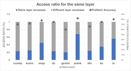 Figure 16 shows the access ratio between the number of times that the same correlated line was accessed and not accessed for the entire memory access. As a result, we can observe that the greater the number of accesses that occur on the same correlated line, the higher the accuracy of our proposed model. This is because, as the number of accesses to the same correlated line increases, there are more opportunities for prefetching through module S, which can cover a large memory range with high prefetch accuracy. Therefore, our proposed model shows the best performance in the case of a prank.
