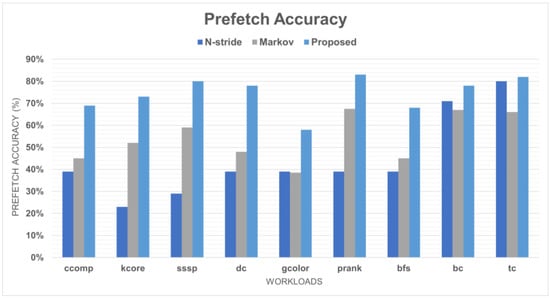 A Markov prefetcher shows a valid accuracy in most cases. The Markov prefetcher analyzes the correlation through the history table and can cope with both irregular and regular patterns. In a correlated line level access, many memory requests show simple stride patterns. However, it is difficult to find such a stride when analyzing a pattern in the overall access order without considering the correlated line level. In other words, our proposed model can detect the memory access pattern by analyzing more details in the correlated line level that other prefetchers fail to consider. As a result, our proposed model shows the highest prefetch accuracy in every workload. Figure 17 and Figure 18 demonstrate that our proposed model outperforms the two basic models by analyzing memory access patterns in more detail.