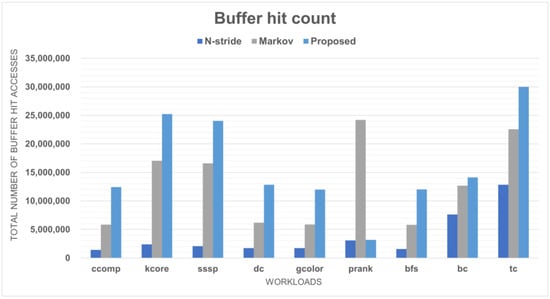 By contrast, the Markov prefetcher shows a good performance in terms of the buffer hit count. This means that prefetching was conducted well when considering the correlation between deltas. Nevertheless, our proposed model outperforms all other models in all cases except for bc. This is because the proposed model performs aggressive prefetching while maintaining the maximum accuracy through the three modules.