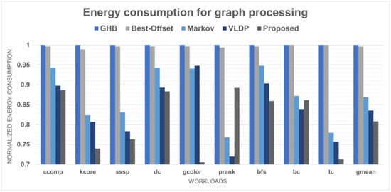 On average, the performance of our model was greater by 6% and 2%, respectively, than those of the Markov and VLDP prefetchers. Figure 20 shows the results in terms of the energy consumption. In terms of energy consumption, our proposed model shows a significant improvement over the GHB and BO prefetchers. These two models and our proposed model show a good performance regarding the prefetch accuracy. However, the performance gap corresponds to a difference in coverage ratio according to the number of prefetch candidates. In other words, the number of hits in the buffer differs owing to the coverage, which causes a significant difference in terms of energy consumption. As a result, our proposed model showed an 18% performance improvement over the two aforementioned models. In addition, when compared to the Markov and VLDP prefetchers, our proposed model shows an extremely improved performance in the cases of gcolor and kcore. These two workloads have the most irregular access pattern among those evaluated. This result shows that proposed model reacts better to irregular patterns than the other models. In addition, these two models have many opportunities to perform prefetching when accesses to other correlated lines occur. Therefore, this means that the prefetch coverage has been increased significantly owing to module B. As a result, our proposed model achieved an average improvement of 6% and 2.3%, respectively, in terms of energy consumption compared to the Markov and VLDP prefetchers.