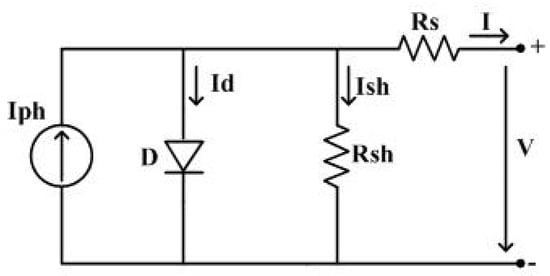 A single-diode model of a PV cell is depicted in Figure 2 []. The accuracy of the single-diode model is high and its complexity is low [,,,,] compared to two-diode modeling [,,,]. A single-diode model is widely used by researchers [,] and is a reliable model for MPPT algorithm analysis [,,,,]. The physics of the p-n junction of a PV cell are governed by five main parameters which are photon current Iph, output current I, terminal voltage V, shunt resistor Rsh, and series resistance Rs. The shunt resistor, Rsh, shows the leakage current of the p-n junction, while series resistance, Rs, represents the combination of the contact resistance, metal grid, and p and n layers [].