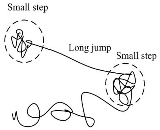 where is the length of the flight, represents the variance, and q is infinite variance at . The distribution pattern of the Levy flight is shown in Figure 4 []. It is observed that the pattern of the Levy distribution is inconsistent as the step varies in the form of a large step, small step, and long-distance jump [,]. Thus, if this pattern is incorporated in metaheuristic algorithms, especially in nonlinear situations, it will significantly improve the search efficiency [].