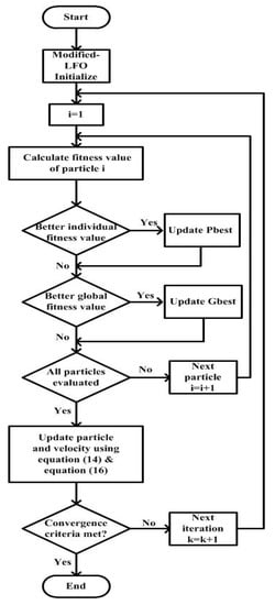 There are few modifications in incorporating the modified Levy flight algorithm in MPPT. Initially, the assigned particles are needed to determine the search space. The particles represent the duty cycle, D, i.e., Di (i = 1, 2, … n). Here, n denotes the total number of particles. Next, the step size, α needs to be determined. Then, the fitness function, f’, is the power of the PV.
