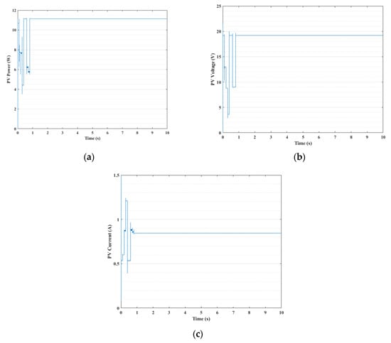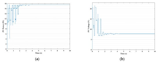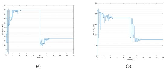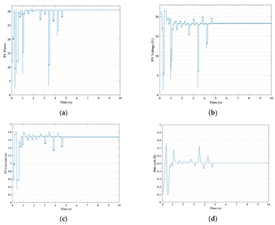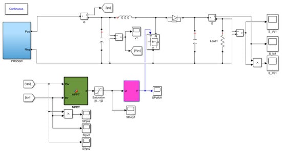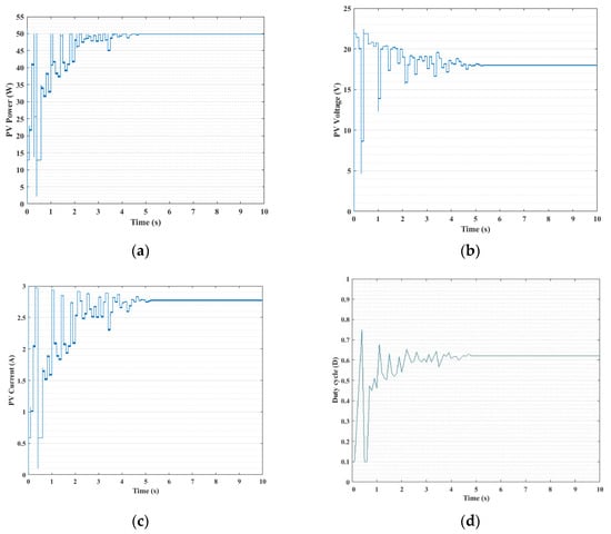 The effectiveness of the proposed algorithm is verified with simulation in the MATLAB/Simulink environment. The circuit model is shown in Figure 6. This system consists of a PV panel, boost converter, MPPT controller, and load []. The boost converter is chosen in this application due to its popularity among researchers as it has a low voltage ripple []. The parameters of the boost converter are listed in Table 1. The converter is connected to a resistive load of 50 Ω. A PV module, PMS50W, with specifications as listed in Table 2 is used.