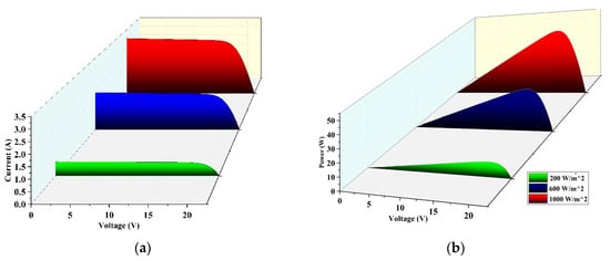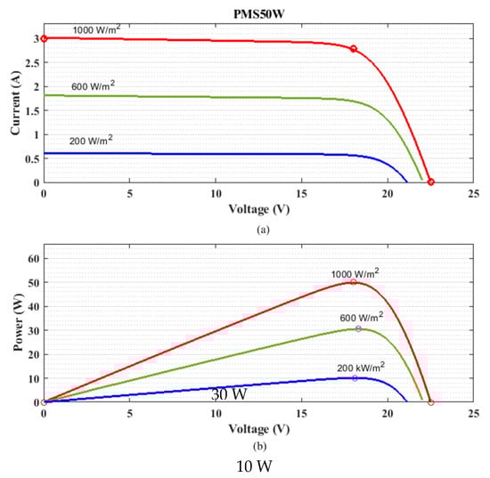 (a) I-V and (b) P-V curves of PMS50W at high (1000 W/m2), medium (600 W/m2), and low (200 W/m2) irradiances.
