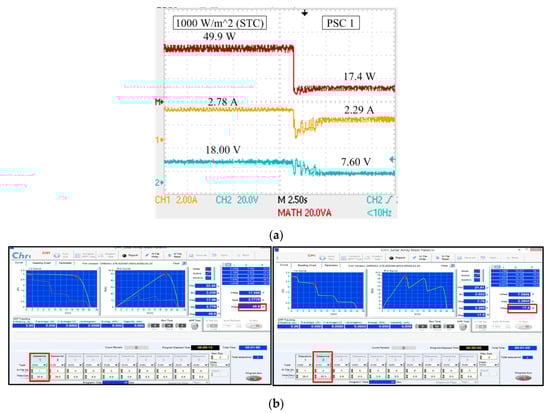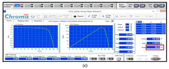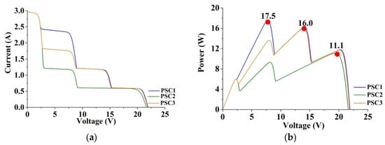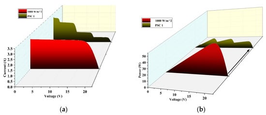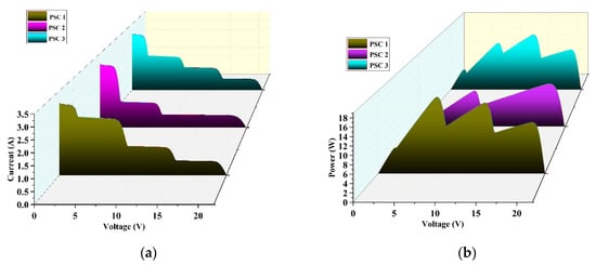 Next, the proposed algorithm is tested under the partial shading condition (PSC) as shown in Figure 8. The characteristics of the I-V and P-V curves under PSCs are shown for three different conditions. Based on Figure 8, it can be noted that multiple peaks occur along the curve. This phenomenon happens due to non-uniform irradiances that penetrated into the PV module as shown in Figure 9. Multiple peaks here include LMPP and GMPP. The irradiance patterns of the PSCs are summarized in Table 4.